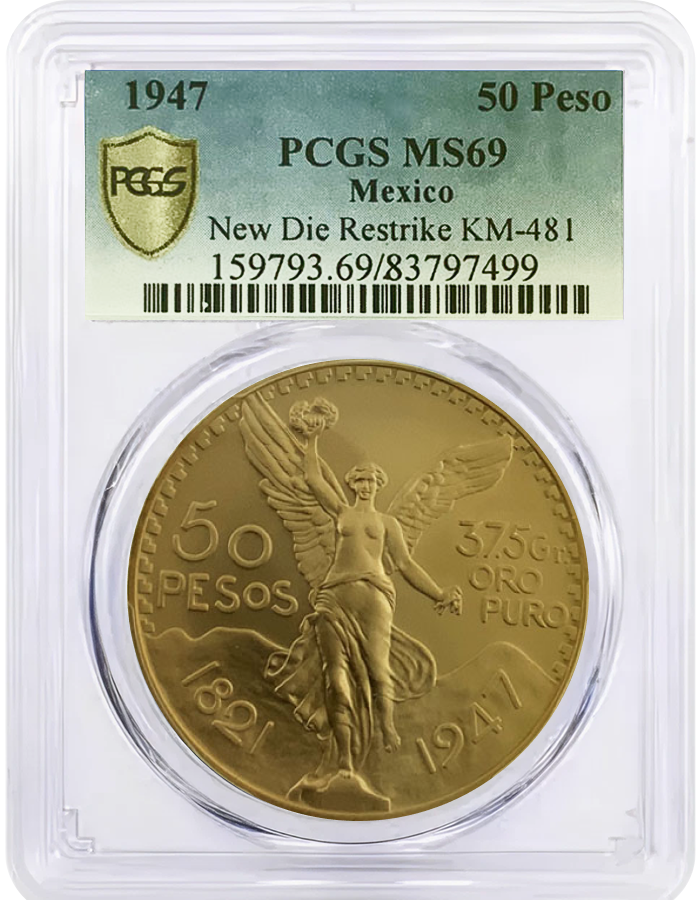 Today, the 1947 Mexico Gold 50 Pesos (New Die Restrike) MS69 PCGS is available from hollywoodgoldexchange.com.